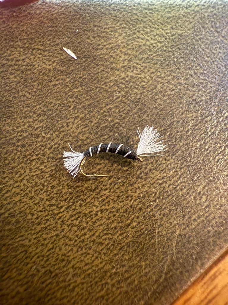 size 14 Dry Fly hook Black (any colour) thread Coq de Leon tail (substitute – any hackle) Any sort of Rusty Dubbing Glow bright for indicator CDC – Natural or Brown (or any other colour)